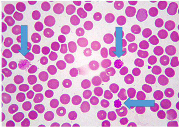 Figura 3 – Macrotrombocitosi in un Norfolk terrier: alcune macropiastrine sono indicate dalle freccce ed hanno un volume stimabile apparentemente simile a quello di un eritrocita.