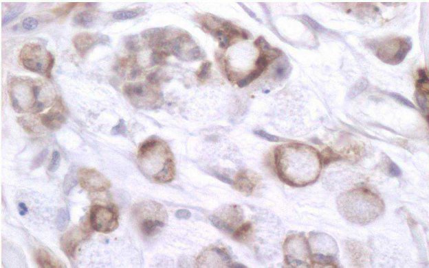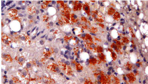 Figura 2 - Colorazione istochimica Rodanina: accumulo patologico di rame score 4. Presenti ampi gruppi di epatociti peri-portali positivi con colorazione granulare citoplasmatica grosso-arancio intenso.