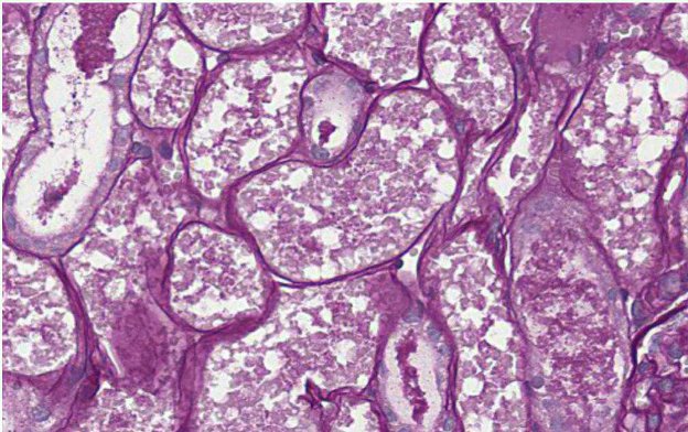 Il primo step avviene mediante la colorazione istochimica Rodanina, eseguibile su campioni di tessuto epatico fissati in formalina. La Rodanina, per affinità tintoriale, permette di stimare grossolanamente la quantità di rame all’interno degli epatociti (Figura 2); ci fornisce inoltre informazioni sulla sua distribuzione “spaziale”, ovvero la sua localizzazione nel lobulo epatico. Nei disordini genetici primari (come nel caso del Bedlington Terrier che ha una deficiencies genetica della proteina COMMD1), la localizzazione è primariamente centro-lobulare, con estensione nelle altre porzioni del lobulo man mano che la malattia progredisce. Per contro, un pattern peri-portale è associato ad un accumulo secondario, da colestasi o accumulo dietetico.