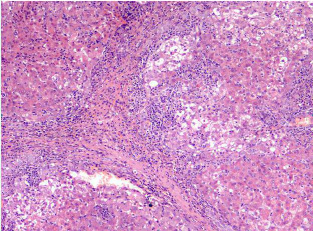 Figura 1 - Epatite cronica da interfaccia con marcata flogosi linfoplasmacellulare e neutrofilica, necrosi/apoptosi epatocellulare, fibrosi a ponte e proliferazione duttale (Ematossilina ed eosina).