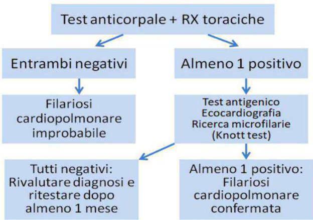 Per i vari aspetti sopra descriotti la diagnosi è dificile: rilevare micro filarie è alquanto raro, perché i classici test antigenici utilizzati nel cane, hanno nel gatto una Bassa sensibilità a causa del ridotto numero di parassiti adulti. Più sensibili sono invece i test indiretti, che permettono l’identificazione di pazienti sieropositivi, che hannocioò sviluppati anticorpi contro gli antigeni parassitari. Per le medesime ragioni (pau-ciparassitismo)anche l’ecocardiografia,utilizzata per rilevare parassiti adulti nelle camere cardiache, non è dotata di elevata sensibilità (Vedi schema in Figura 3).